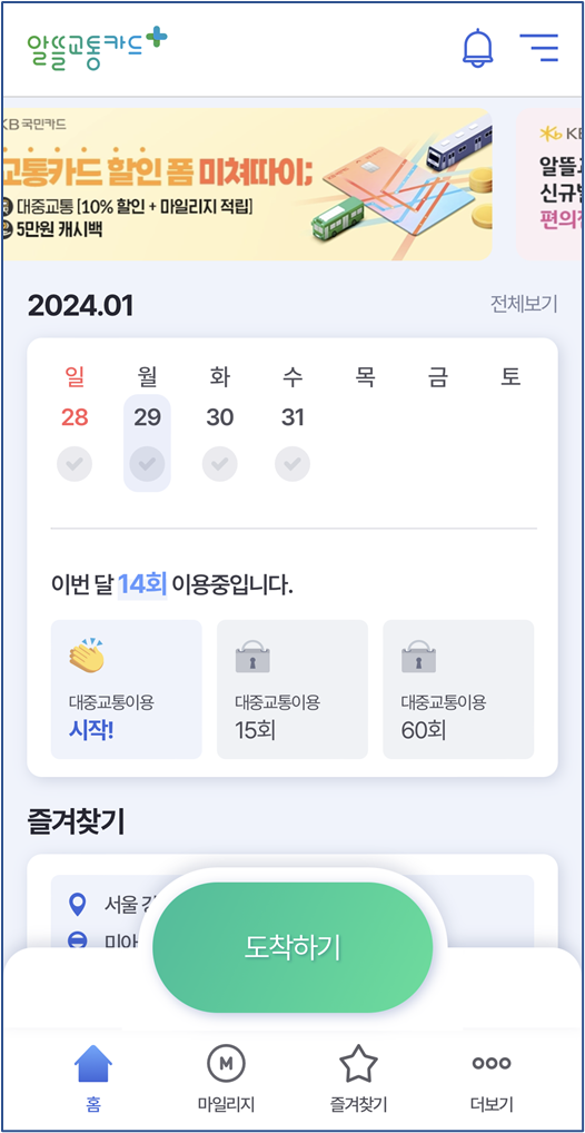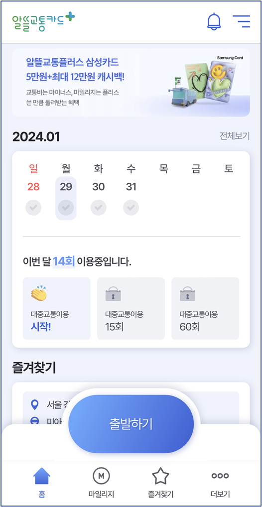 다음 달에 환불받을 수 있는 교통카드로, 별도의 앱을 설치할 필요가 없으며, 이동 거리에 상관없이 최소 월 21회에서 최대 월 60회까지 적립이 가능합니다.